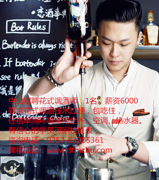 中山招聘花式調酒師:1名,薪資6000,要求花式調酒技術過硬,包吃住,住宿單間環境家電全齊、空調、熱水器。有信心的學員可回校填表,咨詢電話:0757-83205361. 課程點擊:m.aetas.cn