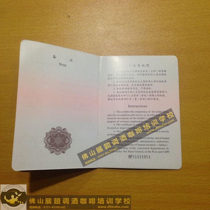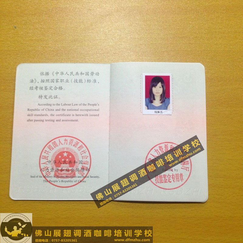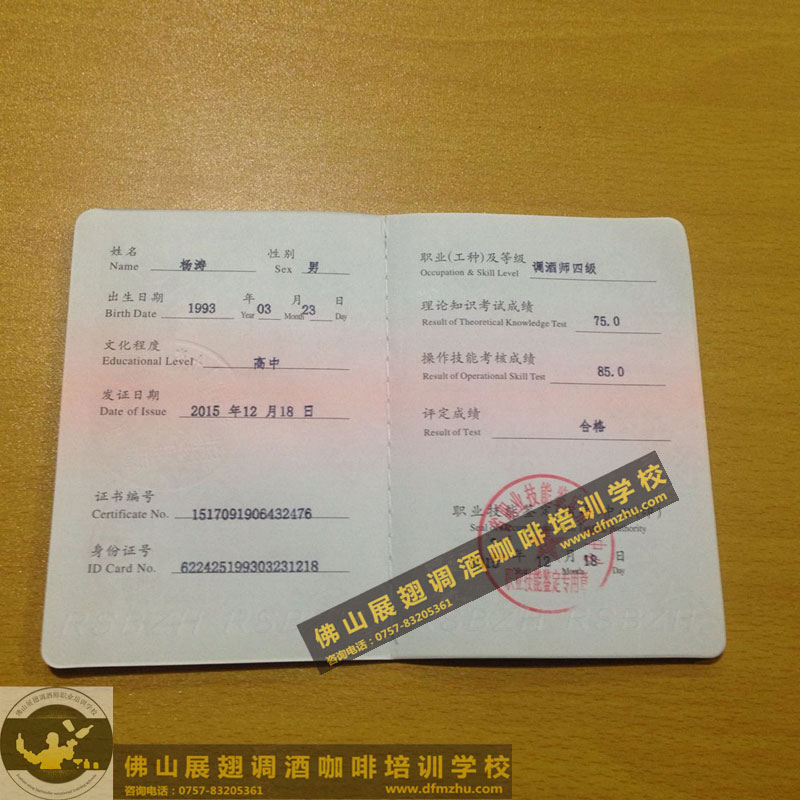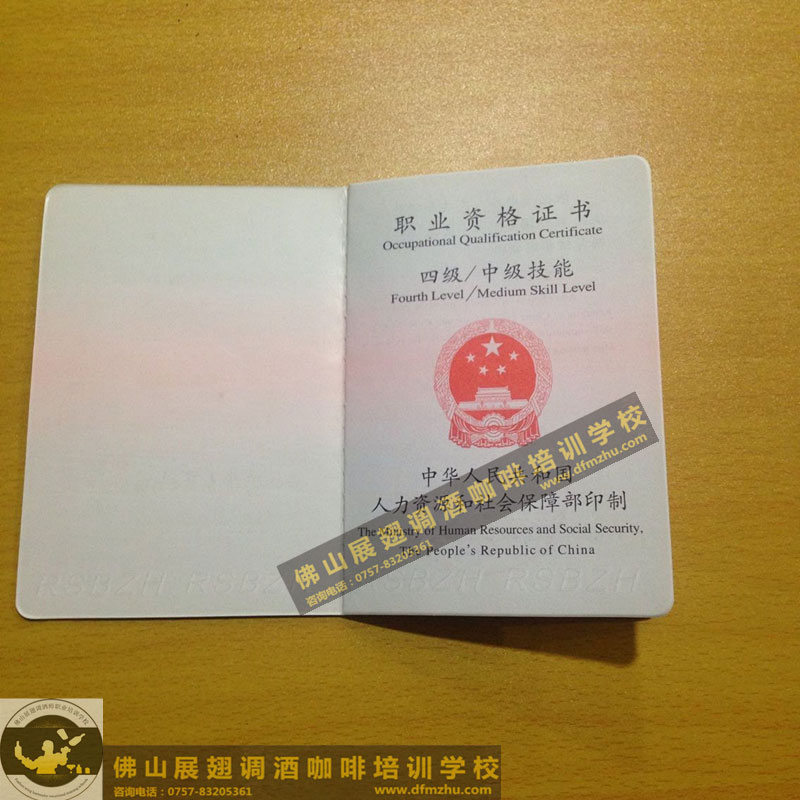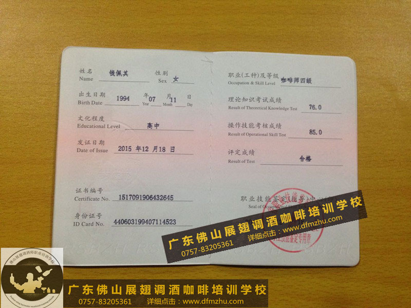 中英文版的職業(yè)資格證書出國通用。(調(diào)酒師、咖啡師、西點師職業(yè)資格證書)佛山展翅調(diào)酒咖啡西點培訓(xùn)學(xué)校畢業(yè)學(xué)生,100%通過率,順利拿到中華人民共和國人力資源和社會保障部,頒發(fā)的調(diào)酒師、咖啡師、西點師職業(yè)資格證書部分樣版。